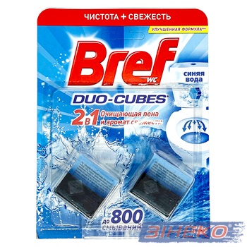 Гігієнічна чистота унітаза та свіжий запах у туалеті протягом тривалого часу – все це можливо з очищаючими кубіками Bref для зливного бачка. Засіб створиний на основі формули 2 в 1, забарвлює воду в блакитний колір і наповнює повітря свіжим ароматом під час кожного зливання води. Його дія спрямована на боротьбу з вапняним нальотом та забрудненнями.