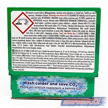 Склад: менше 30% аніонні ПАР; 5-15% мило; більше 5% неіоногенні ПАР, фосфонати; ензими, оптичні відбілювачі, ароматизатори, альфа-ізометиліонон, цитронелол, евгенол.
