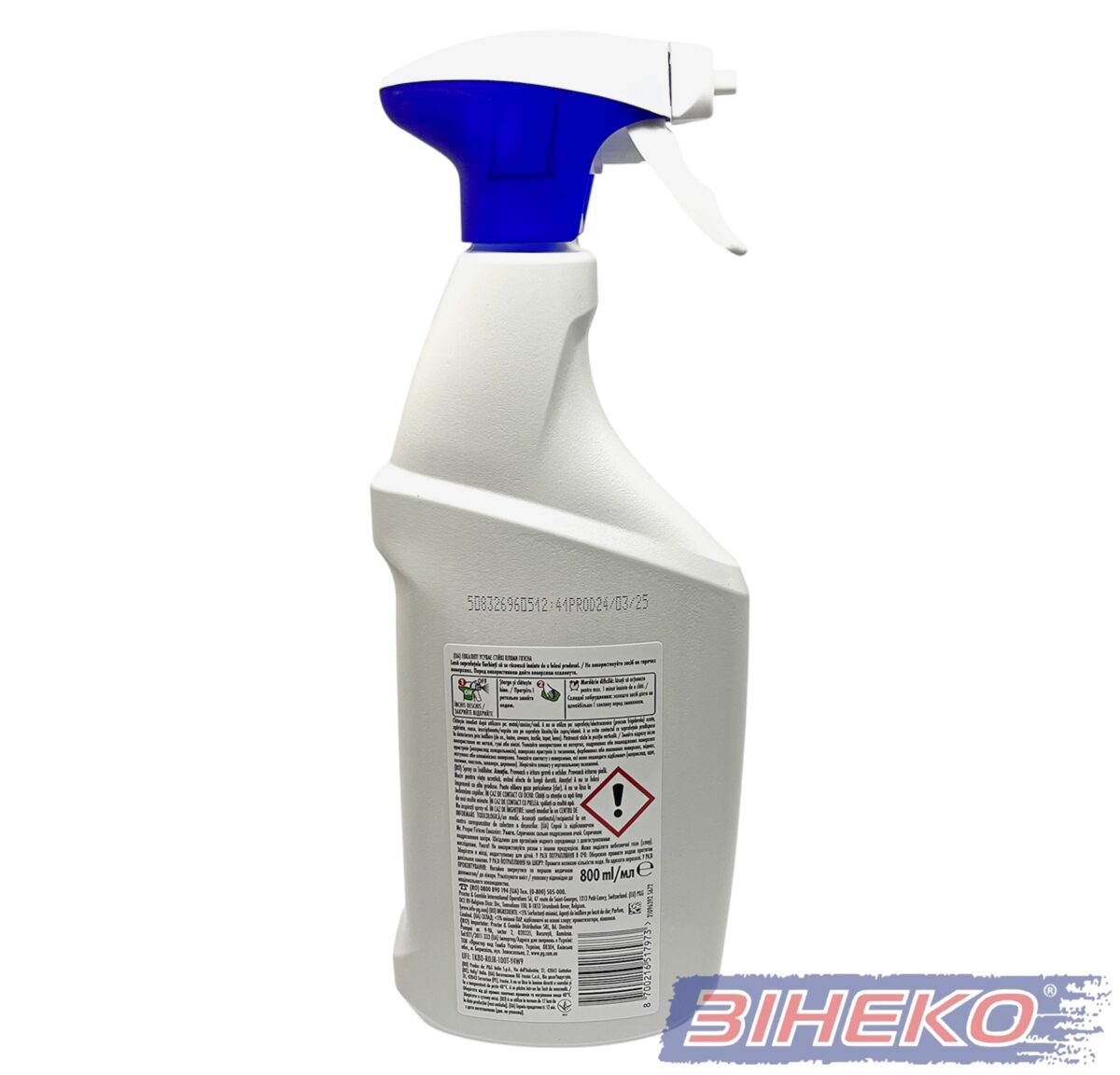 Увага! Провокує подразнення шкіри, ризик серйозного пошкодження очей. Зберігати в недосяжному для дітей місці. У разі необхідності звернутися до лікаря та показати цю ємність(етикетку). Не вдихати спрей. При потраплянні в очі, обережно примити очі водою протягом декількох хвилин. Не змішувати з відбілювачами чи іншими миючими засобами.