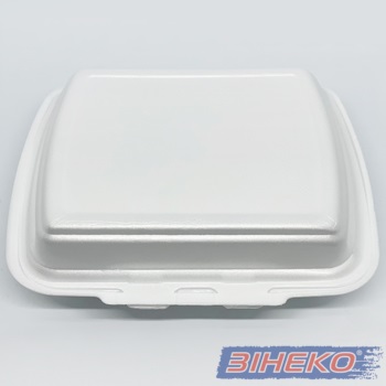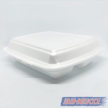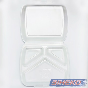 Ланч-бокс з полістиролу НР-3 для упаковки продуктів харчування, поділяється на два маленькі ділення і одне велике.