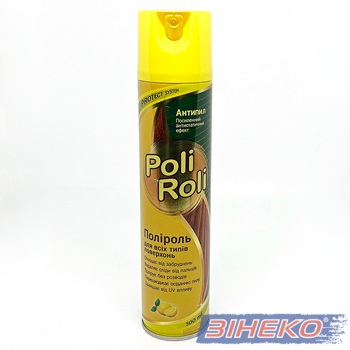 Поліроль для всіх типів поверхонь Поліроль Poli Roli “Антипил” – зручний і ефективний засіб для догляду за будь-якими видами меблевих поверхонь, включаючи пластик, дерево, мармур, скло, панелі відео-аудіоапаратури. Має посилений антистатичний ефект, легко видаляє пил і перешкоджає її осіданню. Пінообразна активна формула легко видаляє брудні плями і сліди від пальців, ідеально захищає поверхні від впливу сонячних променів і надає їм натуральний блиск. При регулярному використанні нейтралізує більшість невидимих алергенів. Має свіжий і приємний аромат лимона.