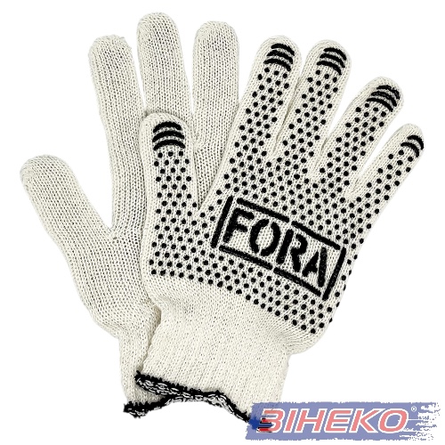 Рукавички трикотажні FORA для захисту від механічних впливів з нанесенням ПВХ. Виготовлені з якісного трикотажу, тому в ній зручно працювати як восени, так і в літку, виконуючи роботи всередині приміщення або займаючись зовнішнім процесом. Точковий облив ПВХ нанесений по всій внутрішній частині долоні, а на подушечках пальців використовується малюнок у формі хвилі, що забезпечує високе зчеплення з матеріалами та інструментами, зокрема з гладкою поверхнею. Для надійного захисту від пилу, сміття, сторонніх матеріалів на зап’ястку є трикотажна гумка.
