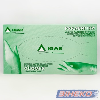 Рукавички медичні латексні оглядові нестерильні припудрені торгової марки IGAR, добре тягнуться, облягають руку, м’які та еластичні, стійкі до розриву та протирання. Легко одягаються, та знімаються, припудрені зсередини модифікованим крохмалем. Універсальна форма рукавичок підходить для лівої та прової руки, вони відповідають високим вимогам контролю якості.