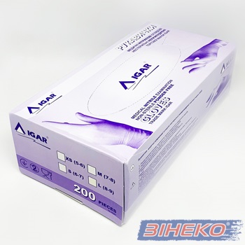 Рукавички Мед IGAR (нітрил фіолет- міцні) без пудри 200 штук / 100 пар розмір L (8-9) в боксі (7% ПДВ) Ви можете купити в компанії”ЗІНЕКО”.