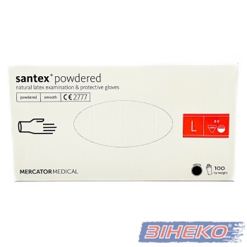 Рукавички SANTEX povdered латекс р.L (100шт) в боксі припудрені (7% ПДВ)