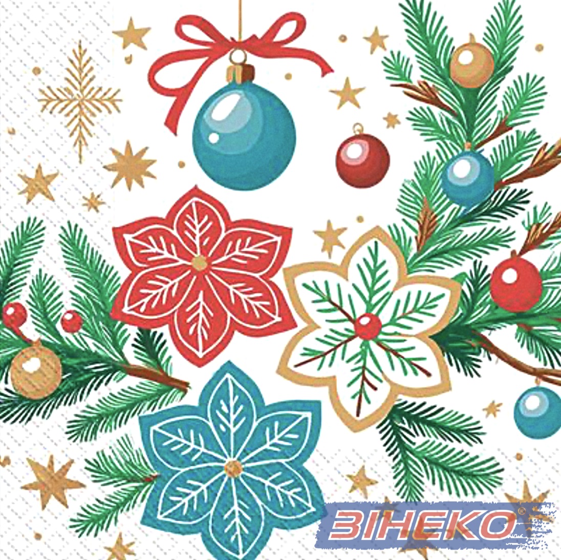 ГоловнаСерветки з Новорічним малюнком Серветки 33х33 Гілочка з прикрасами Марго 18шт