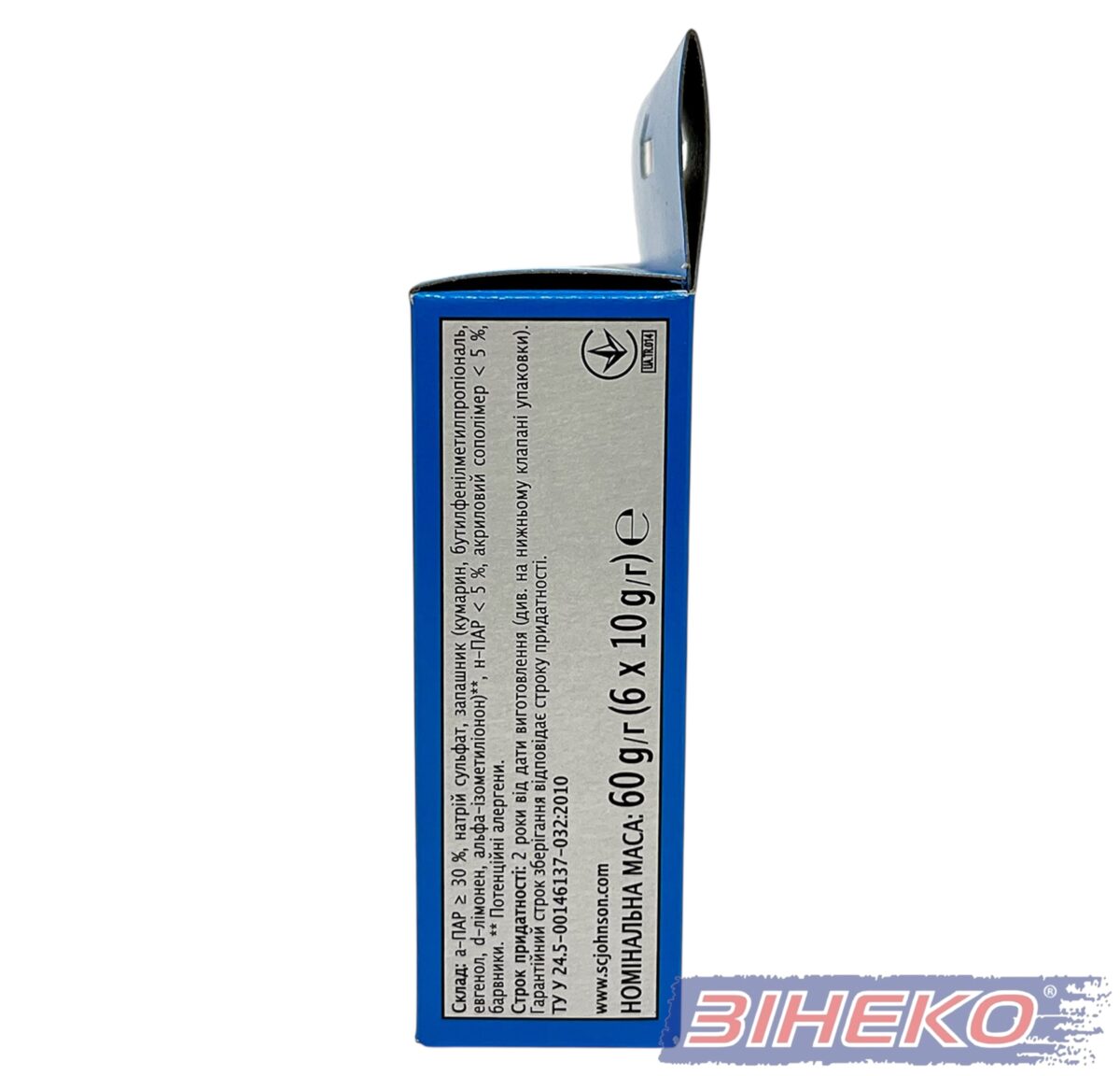 Склад: а-ПАР ≥30%, натрій сульфат, запашник (кумарин, бутилфенілметилпропіональ, евгенол, d-лімонен, альфа-ізометиліонон), н-ПАР <5%, акриловий сополімер <5%, барвник.