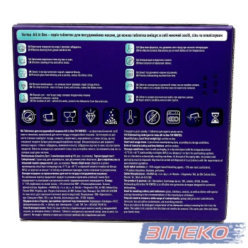 Vortex All in 1 – серія таблеток для посудомийних машин, де кожна таблетка вміщує в собі миючий засіб, сіль та ополіскувач.