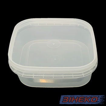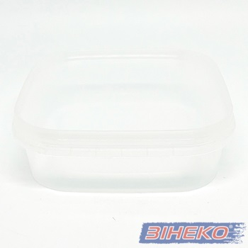 Ємність з кришкою квадратної форми та контрольним замком , що гарантує міцність та високу якість тари. При танспортуванні за рахунок контрольного замка, вміст не розільється, не висипиться, що є практично, як для продавця, так і для покупця. Ємність прозорого кольору, що дає покупцеві бачити вміст продукту, виготовлена з нетоксичних речовин та зручна у використанні.