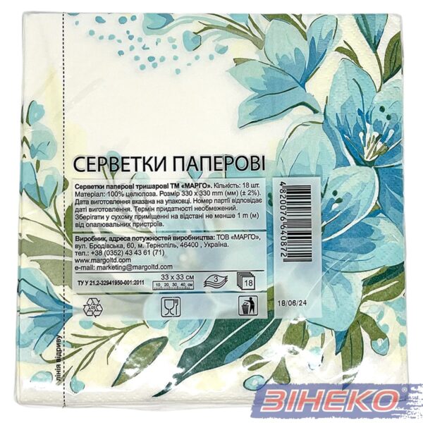 Серветки 33х33 см 3- шарові 18 шт “Голубі квіти” Марго Ви можете купити в компанії «ЗІНЕКО». Серветки паперові з малюнком